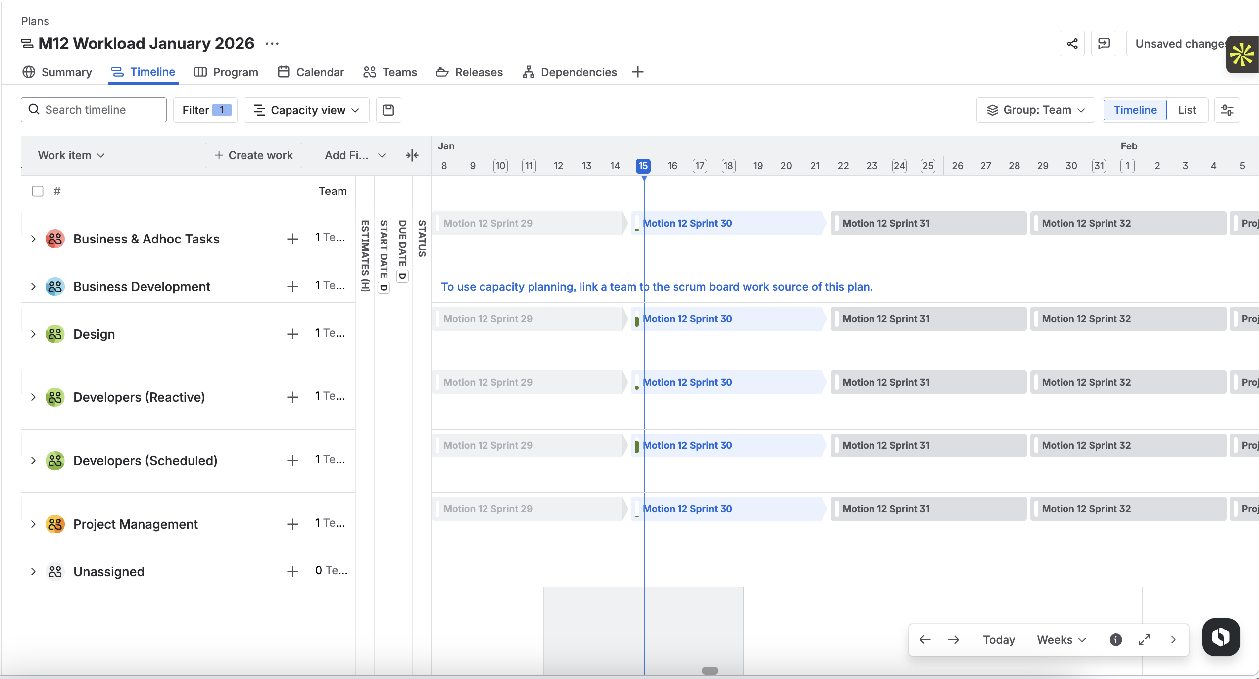 Firstly, as we’re working through the sprint planning session, we will assign tasks to each team with the time estimates, start dates and due dates set. Whilst we are assigning these to the teams, we navigate over to the capacity view to ascertain how much capacity and available hours each team currently has before we carry on adding tasks.