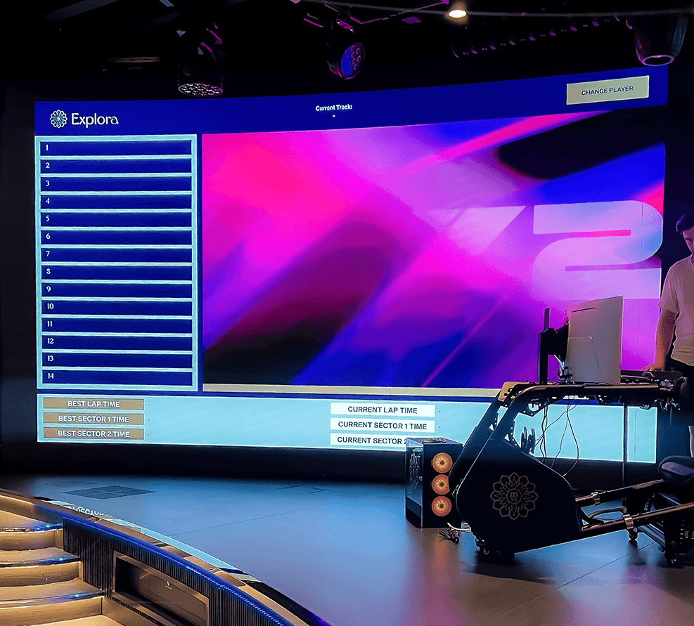 After thorough testing, we trained Explora’s on board team to manage the setup, then installed it across two of their ships. The end product? A fully bespoke, immersive racing experience that turned friendly competition into an unforgettable highlight at sea.